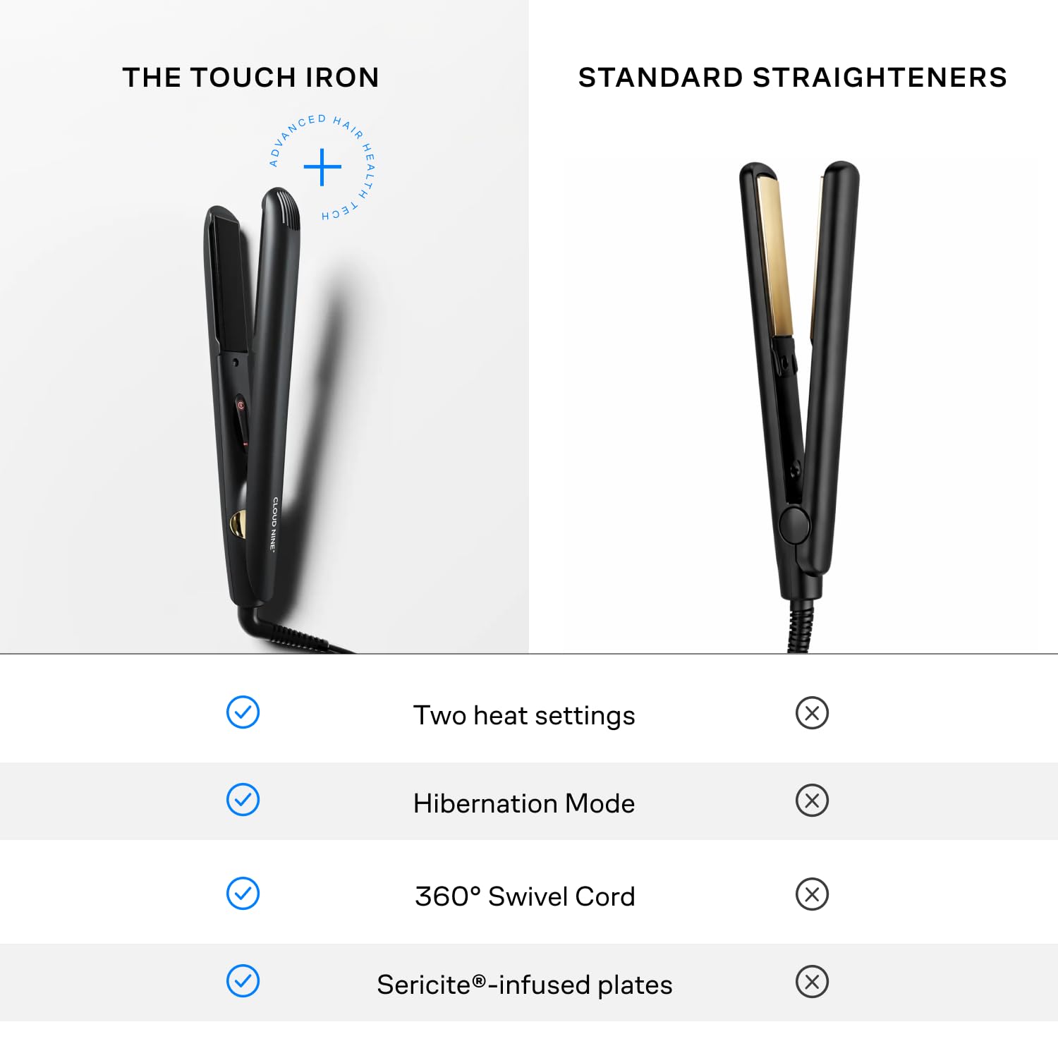 - VARIABLE TEMPERATURREGELUNG: Wenn es um Hitze geht, ist weniger mehr. Deshalb verfügt der Touch Iron über eine variable Temperaturregelung von 165 °C bis 195 °C. Für eine Vielzahl von Haartypen. Das bedeutet, dass Sie mit der für Sie am besten geeigneten Temperatur stylen können. Denn kein Haar ist wie das andere.